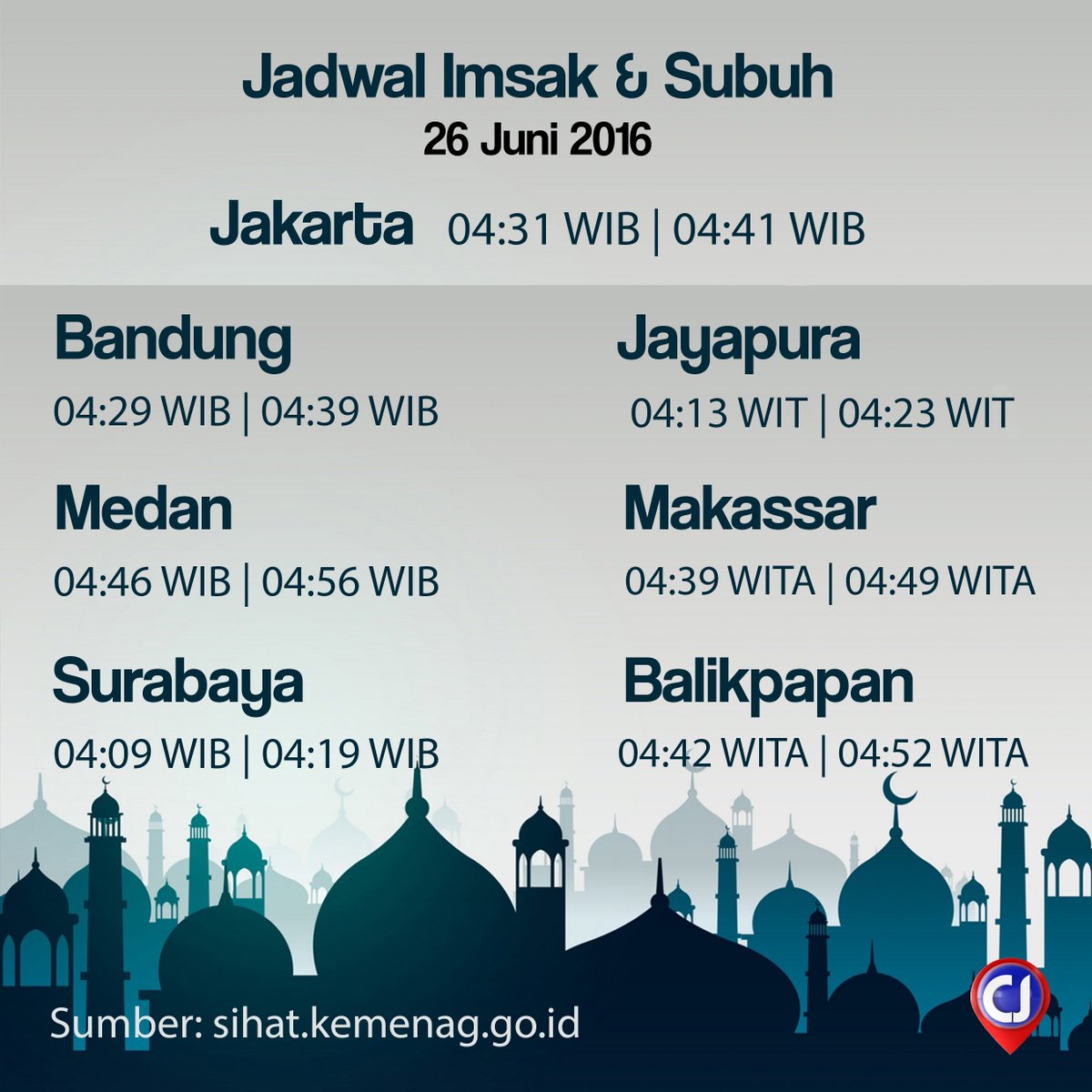 Kali salat muslim di jakarta hari ini, fajr, dhuhr, asr, maghrib & isha'a. Hal ini seperti diriwayatkan dalam hadits abu dawud, tirmidzi, dan nasai dari ummul mukminin hafshah yang mana rasulullah saw bersabda, barang siapa yang tidak berniat puasa di malam hari sebelum terbit fajar. Waktu imsak diawali 10 menit sebelum waktu subuh dan berakhir saat waktu subuh. Dalam satu minggu terakhir ini angka positivity rate di jakarta itu 13,2%. Jakarta berpotensi hujan disertai petir hari ini.